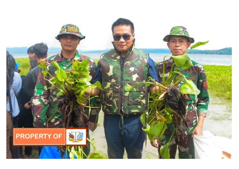 Pangdam I/Bukit Barisan Mayjend Rio Firdianto didampingi Bupati Humbahas Dr. Oloan P Nababan, SH., MH bersama Bupati Kabupaten Toba Efendi S.P. Napitupulu, SE, Bupati Kabupaten Tapanuli Utara Dr. Jonius Taripar Parsaoran Hutabarat, S.Si, M.Si dan Bupati Kabupaten Samosir Vandiko T. Gultom, ST turun langsung ke danau membersihkan eceng gondok.