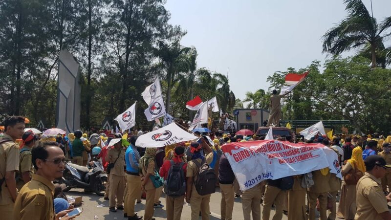 Bekasi, PostKeadilan – Ribuan guru honorer se Kabupaten Bekasi, Jawa Barat yang tergabung dalam Front Pembela Honorer Indonesia (FPHI) menggelar aksi demonstrasi di komplek perkantoran Pemerintah Daerah Kabupaten Bekasi, Desa Sukamahi Kecamatan Cikarang Pusat, Senin (24/9).