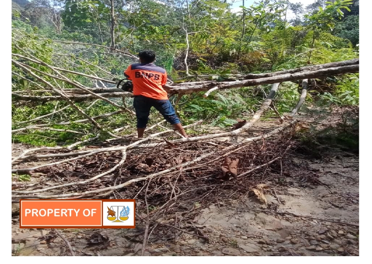 PAKPAK BHARAT-POST Keadilan. Seluruh personil Badan Penanggulangan Bencana Daerah Pakpak Bharat berupaya menormalisasi jalan penghubung Salak-Pagindar setelah sempat terputus total akibat pohon tumbang yang melintang di jalan utama menuju kecamatan Pagindar ini (02/03/3035).