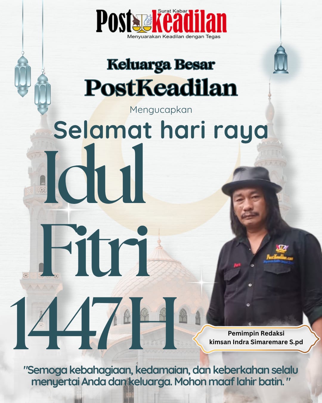 “Selamat Lebaran! Di hari yang suci ini, meski raga mungkin tak selalu bertatap muka, biarlah doa dan maaf saling menjangkau. Terima kasih telah menjadi bagian dari perjalanan saya setahun ini. Mohon maaf lahir dan batin atas segala khilaf. Mari kita sambut hari baru dengan semangat positif untuk kemajuan kita bersama!”