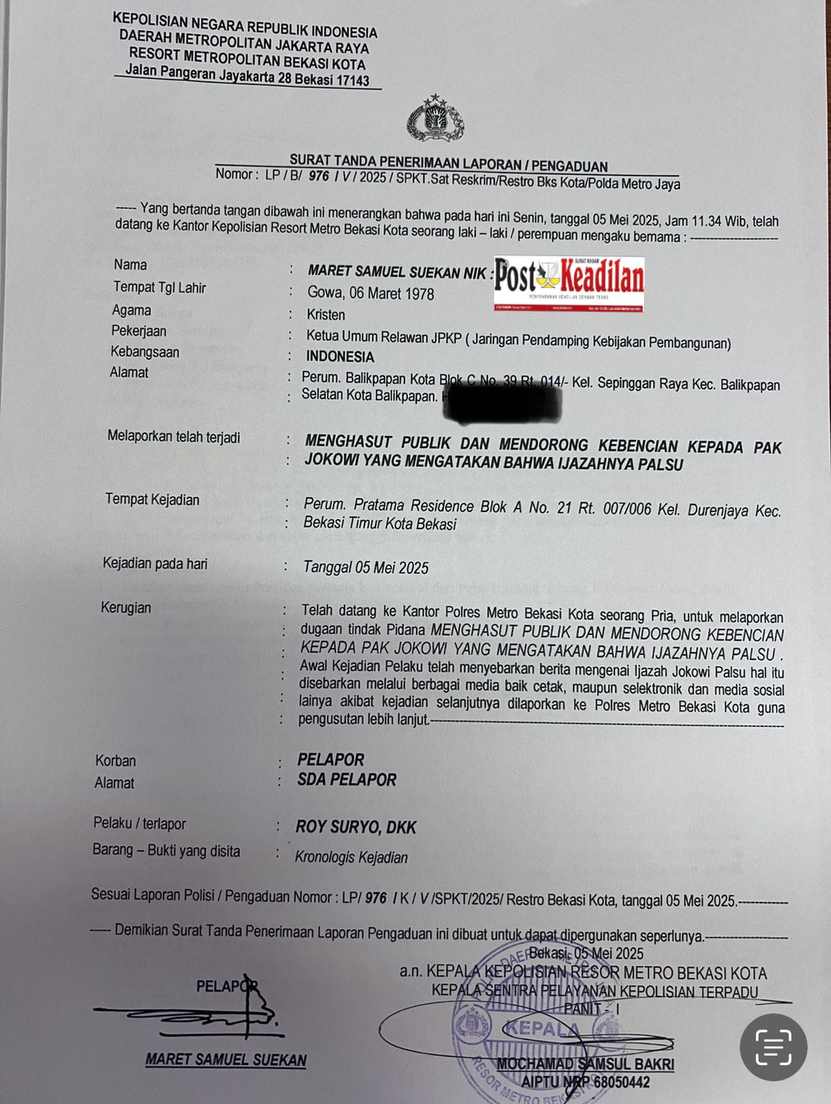 Bekasi, PostKeadilan – Ketua umum (Ketum) relawan JPKP (Jaringan Pendamping Kebijakan Pembangunan) Maret Samuel Suekan akhirnya membuka Laporan Polisi tentang dugaan tuduhan palsu yang dilontarkan Roy Suryo dan kawan-kawannya.