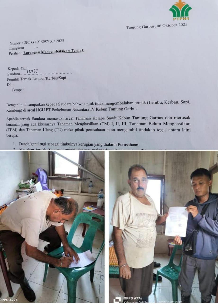 Deli Serdang, Postkeadilan. Manager Kebun Tanjung Garbus PTPN IV Regional 2, Edi Marlon Doloksaribu, menegaskan larangan keras terhadap aktivitas penggembalaan sapi dan kerbau di seluruh areal perkebunan. Kebijakan ini dituangkan melalui surat resmi tertanggal 6 Oktober 2025, yang disampaikan kepada masyarakat sekitar kebun.