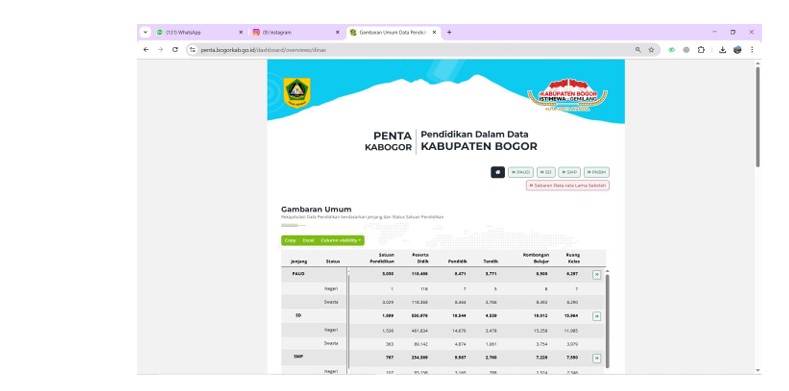 2. selaku pemangku kebijakan layanan pendidikan sesuai dengan Peraturan Bupati Nomor 129 Tahun 2021 Tentang Kedudukan, Susunan Organisasi, Tugas dan Fungsi Serta Tata Kerja Dinas Pendidikan. Dengan dasar tersebut Dinas Pendidikan Kabupaten Bogor meluncurkan program pengembangan sistem Pendidikan Dalam Data (PENTA) dengan harapan tercapainya pemetaan dan pemerataan penyebaran tenaga pendidik dan kependidikan di seluruh satuan pendidikan dengan tujuan pemaksimalan layanan pendidikan bagi masyarakat Kabupaten Bogor.